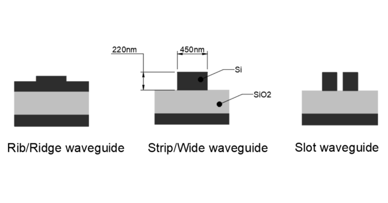 Common waveguide geometries—strip, rib, and slot—used in integrated quantum photonics.