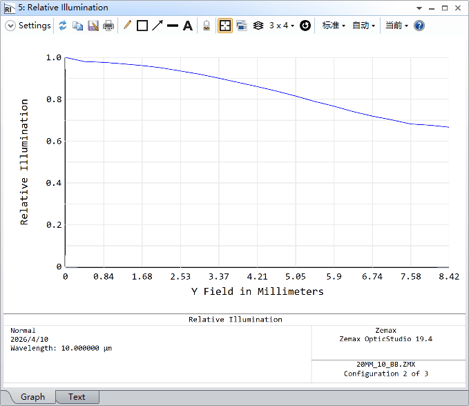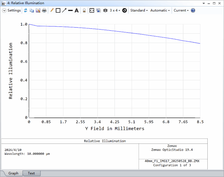 Relative illumination reaches 66% at F/0.85, indicating effective control of vignetting. The CRA (3.52°) is well-matched to typical uncooled detector microlens arrays, minimizing shading and ensuring uniform signal response.