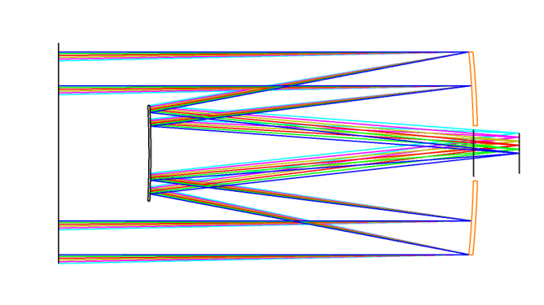 b: Gregorian Ritchey-Chrétien space optics design with a concave secondary mirror. As shown, this design results in a longer distance between the primary and secondary mirrors.
